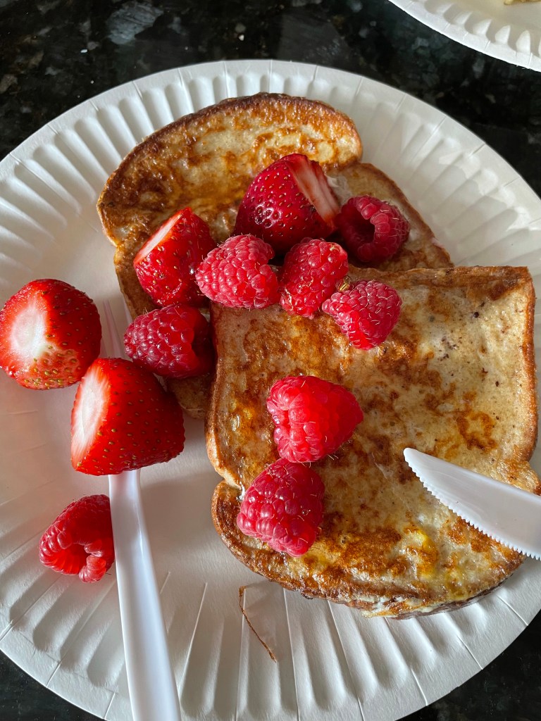 Start with Great Value Honey wheat bread from Walmart—it’s flavorful, not dry, and made from 100% whole wheat flour. Batter it with a mixture of whipped eggs, milk, cinnamon, and vanilla in a bowl. pan-fried in olive oil (for a savory fare) or Canola oil (for a sweeter variation). Top with spray butter, honey, and berries.